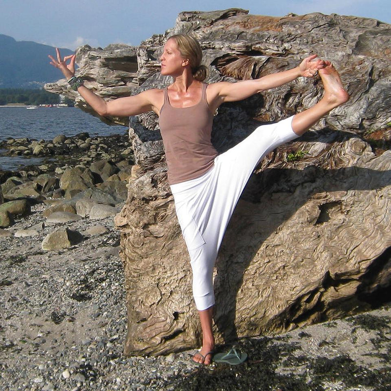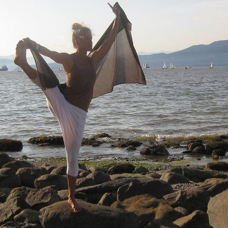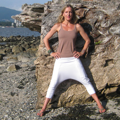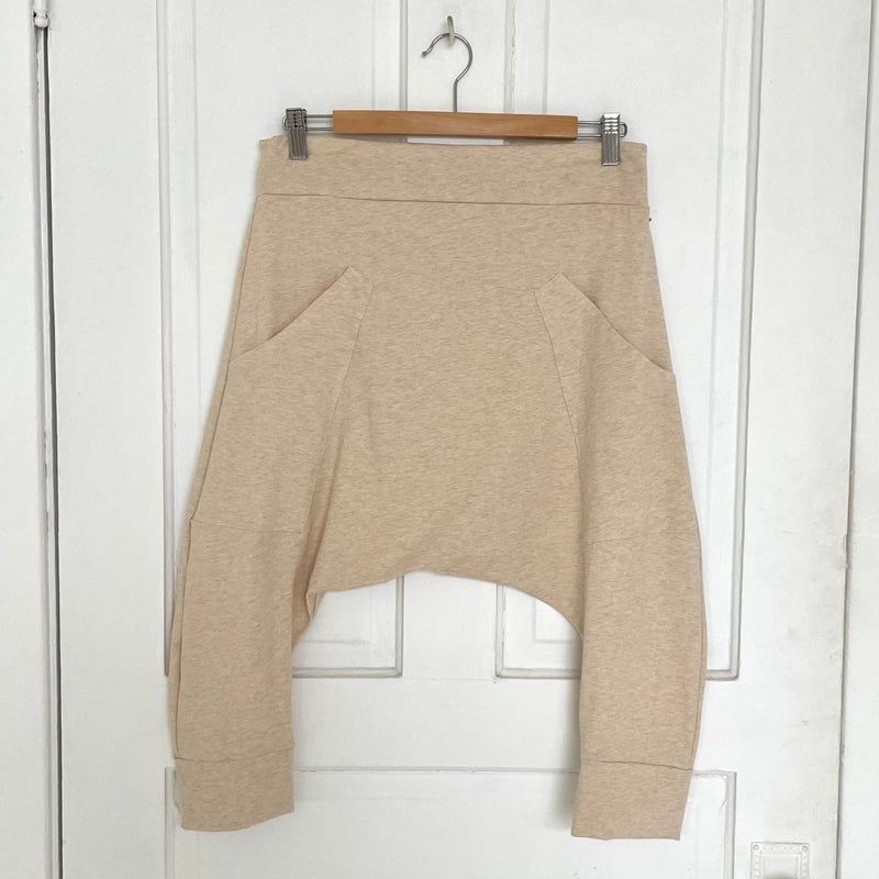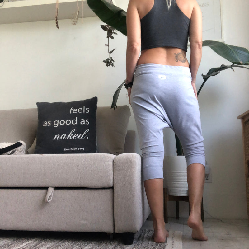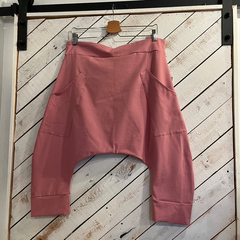 These drop-crotch yoga pants are fashioned with pockets and fall below the knee. Made from soft cotton with a bit of Lycra for stretch and hold.